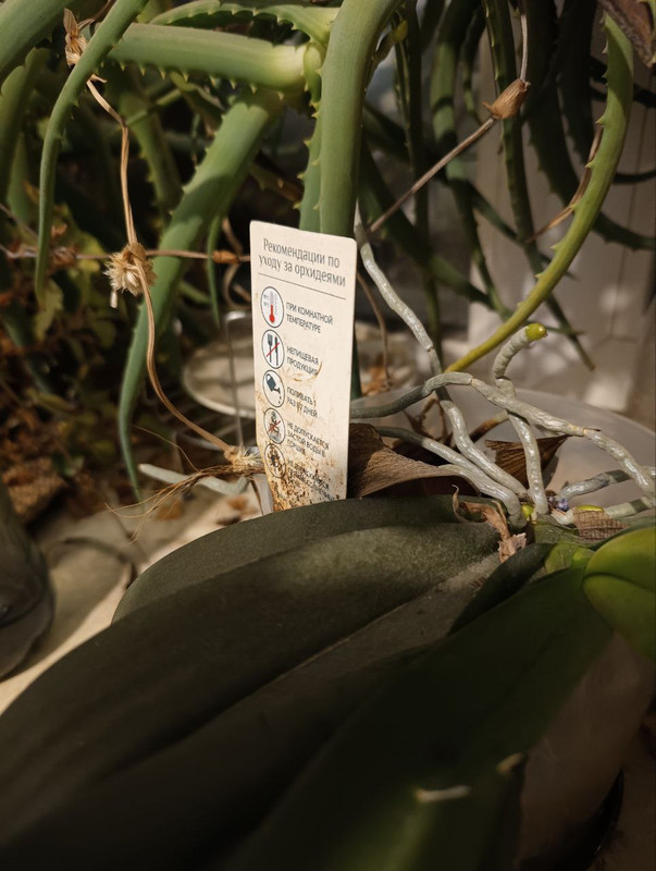 Вот 2,5 года орхидея стояла в одиночестве, ни разу не зацвела и щупальцы к свету не тянула. Я почитал про орхидеи, в тени джунглей Амозонки растут, где много много диких обезьян и прочих зверушек. В общем 2 месяца назад я ее поставил в тень к бабушкиному алоэ и смотрю она медленно и неотвратимо тянет свои щупальца к его мощной сочной ветке или стволу, не знаю как правильно это называется, но то что потянулась это факт.