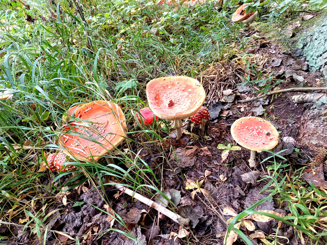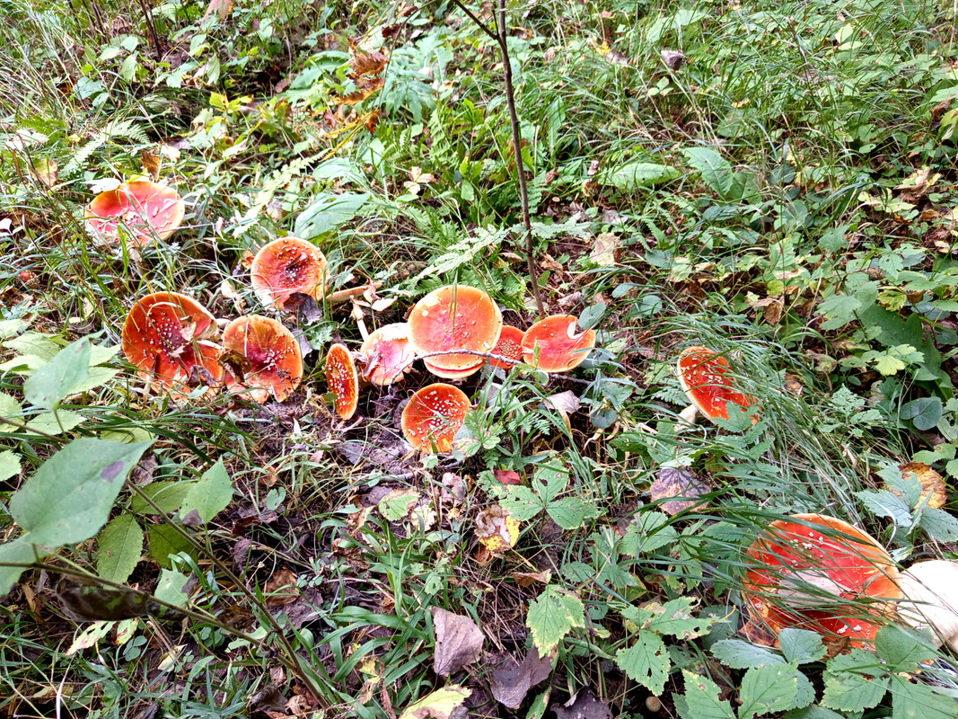 Если не лениться, разгрести листья, можно найти рыжики. Лично я в таких местах грибы собирать не рекомендую, цивилизация близко примерно в 15 км, большинство ТЭЦ работают на угле, спускались мы по лесовозной дороге, по которой лесовозы не ездят уже 30 лет, но техника лесоохраны вполне себе гоняет и грибочки впитывают ее выхлопы.